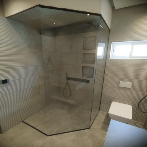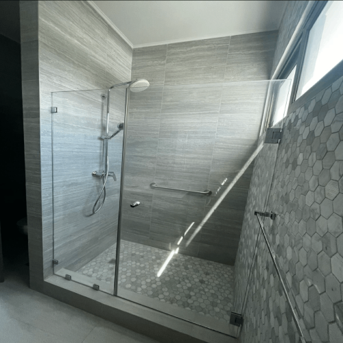Puerta de vidrio templado con bisagras y herrajes de alta calidad. Apertura suave y segura, ideal para baños y espacios modernos. Personalizable en acabados y medidas.